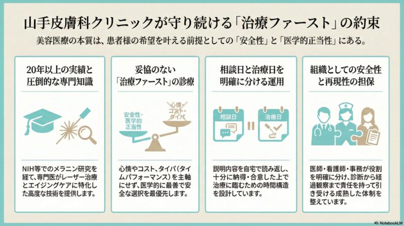 当院は、治療を「その場の雰囲気」や「言葉の印象」で進めるのではなく、医学的根拠・法令遵守・安全性の設計を前提に、説明と同意、記録、運用を整えながら診療を行っています。