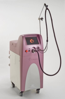 波長595ナノメートルの色素レーザーではVビームⅡが最新機器です。麻酔の注射剤は使用しません。レーザー照射部の先端に内蔵されたダイナミッククーリングディバイス(DCD)という冷却装置が照射の直前に冷却ガスをレーザー照射部に吹き付けて、熱ダメージから皮膚を保護して、疼痛を軽減します。DCD装置により広範囲な病変でも安全に治療することが可能となっています。多発した血管腫、皮膚の浅いところにある血管腫に使用し、一度に広範囲を治療することが可能です。軽くゴムではじかれたような痛みがあります。痛みに敏感な方は麻酔薬を含有したクリーム剤で照射部位を麻酔することがあります。
