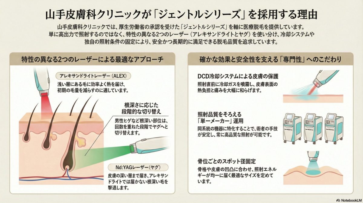 本ページでは、当院の医療レーザー脱毛の方針、使用機器(ジェントルレーズプロ/ジェントルマックスプロ)、アレキサンドライトレーザーとNd:YAGレーザーの考え方、脱毛回数・照射間隔の考え方、施術前後の注意点をまとめます。