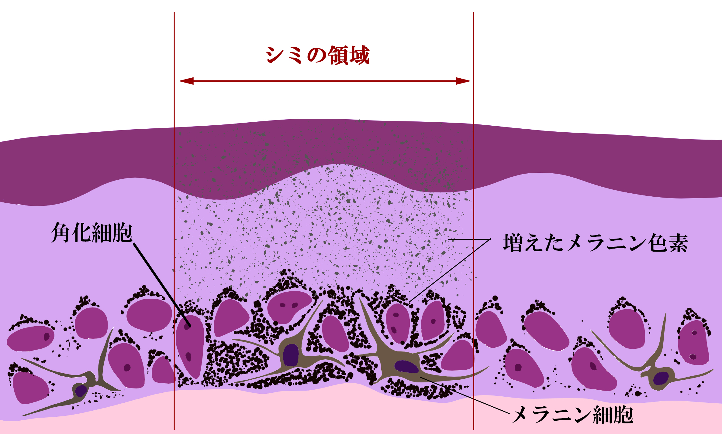 これは、シミの原因がメラニン(色素)を産生するメラニン細胞と考えいるひとが、いまだに多いからです。シミの原因はメラニン細胞を取り囲む角化細胞にあります。