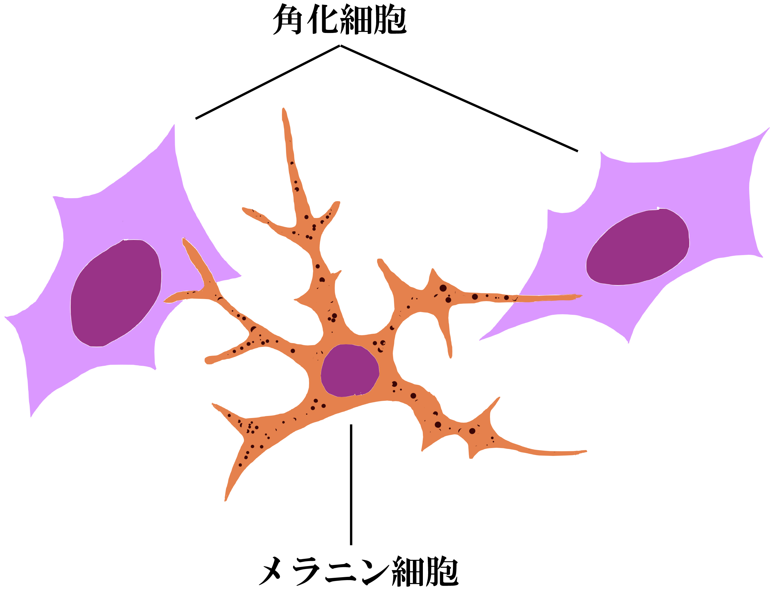 1)メラニン細胞はメラニン色素(”メラニン”あるいは”色素”、同義語です)をつくって、角化細胞に供給することで、皮膚全体にメラニン色素がいきわたり、肌の色をつくっています。いきわたったメラニン色素は紫外線を反射したり、吸収したりして肌を老化と発ガンから守っています。