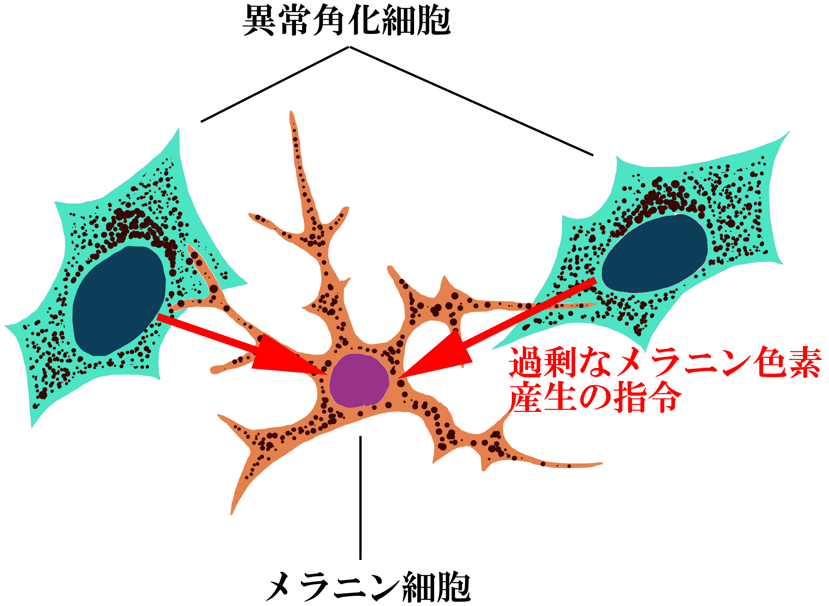 異常角化細胞の指令でメラニン細胞は大量のメラニンをつくるようになり、角化細胞に蓄積していきます。結果、通常の皮膚より色が濃くなった部分が老人性色素斑です。