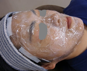顔全体に麻酔クリームを塗って、ラップで覆って麻酔します。 クリーム麻酔と神経ブロック注射を併用します。麻酔に注射では針の刺入部位に針の大きさの点状の内出血がおこります。