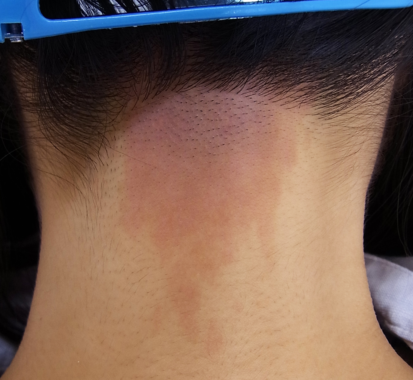 - レーザー光の形状が円形であり、スポット中央のエネルギー密度が高くなっているため、照射直後の膨疹や発赤はややまばらな状態となります。