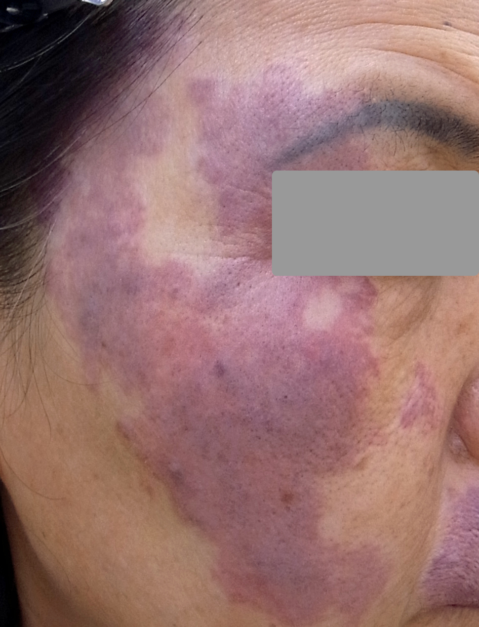 単純性血管腫は赤ワイン色を示すことからポートワイン血管腫とも呼ばれます。原因は皮膚真皮の毛細血管の局所的な異常(奇形)です。生まれたときにすでに存在して、通常は均一な紅斑です。紅斑の色は明るいピンク色から濃い紫色まで様々です。表面は平坦で、周囲との明瞭がはっきりしています。血管腫の主病変が真皮のどの深さに位置するかで、浅在性、深在性、びまん型に分類されます。自然消退はしませんが、皮膚の厚さが加齢に伴って厚くなるため退色する場合もあります。反対に色が濃くなったり、盛り上がって腫瘤を形成する場合もあります。発生の頻度は男性より女性に多く、好発部位は顔面と頸部ですが、四肢にも比較的多く見られます。