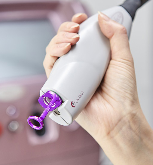 VビームⅡはシネロン・キャンデラ社のVビームの後継機種です。シネロン・キャンデラ社レーザーの特徴ダイナミッククーリングディバイス(DCD)という冷却装置がついていることです。このDCDはレーザー照射の直前に冷却ガスを皮膚表面に吹き付けて、その次の照射されるレーザーの熱から表皮を守ります。このDCDにより安全に治療することが可能となっています。また、DCDは冷却することで照射時の痛みを緩和もおこないます。脱毛に使用するロングパルス・アレキサンドライトレーザー(ジェントルレース)や色素レーザー(Vビーム、VビームⅡ)にはこのDCDが装備されています。